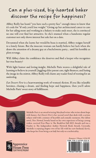 Can a plus-sized, big-hearted baker discover the recipe for happiness? Abbey Reilly has heard "you have such a pretty face" enough times to know that it's code for "if only you'd lose weight." Giving up her architectural career to care for her ailing mom and working in a bakery to make ends meet, she is convinced no one will ever find her attractive. So she's stunned when a handsome regular customer not only shows interest but asks her on a date. Devastated when she learns her would-be beau is married, Abbey resigns herself to a lonely future. But the insecure woman can hardly believe her luck when she draws the attention of a dreamy guy at a bachelorette party... until his horrible ex plots revenge. Will Abbey claim the confidence she deserves and find a keeper who recognizes her true beauty? With light humor and loving insight, Michelle Paris weaves a delightful tale of learning to believe in yourself. Juggling elder parent care, tight finances, and hating the image in the mirror, Abbey Reilly will charm any reader fond of rooting for an underdog. Eat Dessert First is a heartwarming work of women's fiction. If you like relatable heroines, chasing a dream, and finding hope and happiness, then you'll adore Michelle Paris's sweet story of fulfillment.