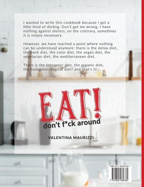 Are you looking for a recipe book for a healthy, low-calorie diet? Don't buy this cookbook! Yes, you heard me right... I wanted to write this cookbook because I got a little tired of diets. Don't get me wrong, I have nothing against dieters; in fact, sometimes it is just necessary. However, we have come to a point where you don't understand anything anymore: there is the Detox diet, the Pank diet, the Color diet, the Vegan diet, the Vegetarian diet, the Mediterranean diet. There is the Ketogenic diet, the Organic, the Homotoxicological... and that's it! Eat! Don't Fuck Around is meant to be an outlet, a shout out to get us a little bit back on track and get back to appreciating good traditional cuisine, the one that may seem a little light, the one that is also greasy, the one that hurts! So much so, as they say, "what doesn't kill, fattens." Inside the cookbook you will find my selection of the best recipes from the Italian tradition, sorted by course: Appetizers First Courses Main Courses Sides Desserts I'll explain how to cook the best, easy way and, take it from me, you'll make look great with family and friends! Here are some examples:Octopus Salad Eggplant Roulades Sausage and Taleggio Risotto Rigatoni with Meatball Sauce Spaghetti alla Nerano Passatelli in Broth Meatballs with Peas Stew with Potatoes Cutlet Bolognese Style Apulian Bombettes Asparagus with Almonds Tomatoes Gratinated Tenerina Apple Strudel ... and much more! And if you're afraid you won't be able to follow the cookbook, don't worry. I have created videos of every single recipe for you! Just go to my YouTube channel and you can cook along with me. Nothing could be easier!