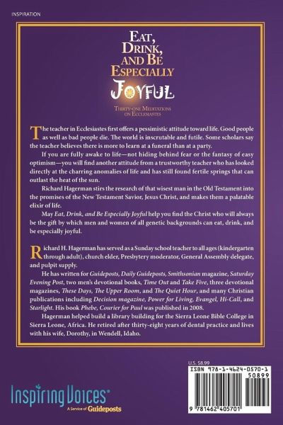 The teacher in Ecclesiastes first offers a pessimistic attitude toward life. Good people as well as bad people die. The world is inscrutable and futile. Some scholars say the teacher believes there is more to learn at a funeral than at a party. If you are fully awake to life—not hiding behind fear or the fantasy of easy optimism—you will find another attitude from a trustworthy teacher who has looked directly at the charring anomalies of life and has still found fertile springs that can outlast the heat of the sun. Richard Hagerman stirs the research of that wisest man in the Old Testament into the promises of the New Testament Savior, Jesus Christ, and makes them a palatable elixir of life. May Eat, Drink, and Be Especially Joyful help you find the Christ who will always be the gift by which men and women of all genetic backgrounds can eat, drink, and be especially joyful.