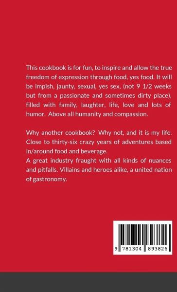 This cookbook is for fun, to inspire and allow the true freedom of expression through food, yes food. It will be impish, jaunty, sexual, yes sex, (not 9 1/2 weeks but from a passionate and sometimes dirty place), filled with family, laughter, life, love and lots of humor. Above all humanity and compassion. Why another cookbook? Why not, and it is my life. Close to thirty-six crazy years of adventures based in/around food and beverage. A great industry fraught with all kinds of nuances and pitfalls. Villains and heroes alike, a united nation of gastronomY.