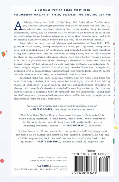 One of Nylon and Chicago Reader's "Books We Can't Wait To Read In 2017," and one of Buzzfeed and Vulture's Best Books to Read This Summer A father searches for his addict son while grappling with his own choices as a parent (and as a user of sorts) Achingly funny and full of feeling, Eat Only When You're Hungry follows fifty-eight-year-old Greg as he searches for his son, GJ, an addict who has been missing for three weeks. Greg is bored, demoralized, obese, and as dubious of GJ's desire to be found as he is of his own motivation to go looking. Almost on a whim, Greg embarks on a road trip to central Florida-a noble search for his son, or so he tells himself. Greg takes us on a tour of highway and roadside, of Taco Bell, KFC, gas-station Slurpees, sticky strip-club floors, pooling sweat, candy wrappers and crumpled panes of cellophane and wrinkled plastic bags tumbling along the interstate. This is the America Greg knows, one he feels closer to than to his youthful idealism, closer even than to his younger second wife. As his journey continues, through drive-thru windows and into the living rooms of his alluring ex-wife and his distant, curmudgeonly father, Greg's urgent search for GJ slowly recedes into the background, replaced with a painstaking, illuminating, and unavoidable look at Greg's own mistakes-as a father, as a husband, and as a man. Brimming with the same visceral regret and joy that leak from the fast food Greg inhales, Eat Only When You're Hungry is a wild and biting study of addiction, perseverance, and the insurmountable struggle to change. With America's desolate underbelly serving as her guide, Lindsay Hunter elicits a singular type of sympathy for her characters, using them to challenge our preconceived notions about addiction and to explore the innumerable ways we fail ourselves.