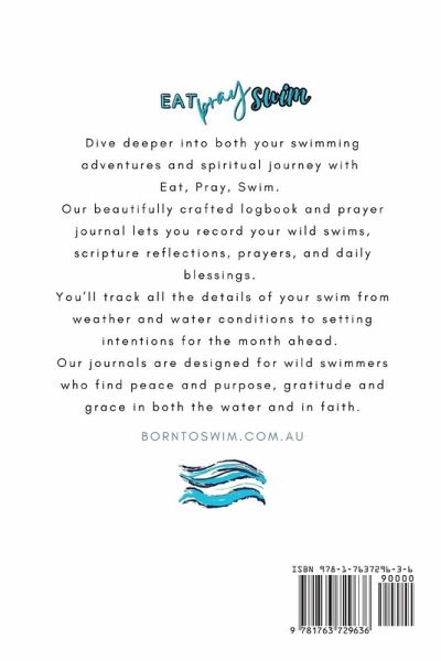 Eat, Pray, Swim: A Swimmer's Logbook and Prayer Journal is the perfect companion for wild swimmers to reflect on both their spiritual journey and their time in the water. Our journals are designed to capture your swimming adventures and your spiritual reflections in one place. Each log page allows you to record vital swim details: Date Air and water temperature, Weather and water conditions, Distance swum, and more... There's also plenty of space to document your personal thoughts, scripture, prayers, and thanksgiving. Whether you're swimming solo or with a group of swim buddies, our journals will help you track not just your progress in the water, but your growth in faith as well. You'll also find sections to: Set monthly intentions, Build a vision board for your swim adventures, Track encounters with wildlife. Our journals are an inspiring keepsake to treasure for years to come. A perfect gift idea for swimmers who seek mindfulness, gratitude, and a closer connection to both nature and God.