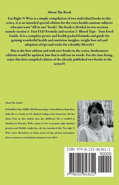 Eat Right N Wise is a simple compilation of two individual books in this series, it is an intended special edition for the extra health cautious subjects who just want "All in one" book!. The book is divided in two sections namely section 1- Fast FAD Formula and section 2- Blood Type - Your Food Guide. It is a complete power and health packed formula and guide for gaining wonderful health and nutrition insights, weight loss aid and adoption of tips and tricks for a healthy lifestyle! This is the first edition and with new books in the series, furthermore editions would be updated, but that is still not in words. For the time being, enjoy this first compiled edition of the already published two books in the series!!!