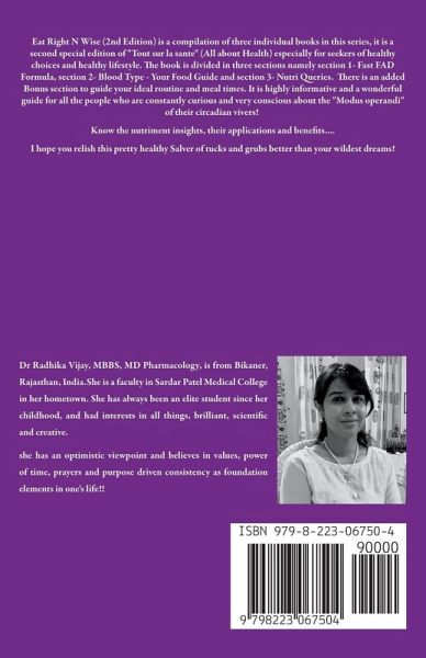 Eat Right N Wise (2nd Edition) is a compilation of three individual books in this series, it is a second special edition of "Tout sur la sante" (All about Health) especially for seekers of healthy choices and healthy lifestyle. The book is divided in three sections namely section 1- Fast FAD Formula, section 2- Blood Type - Your Food Guide and section 3- Nutri Queries. There is an added Bonus Sction with a sample Routine guide and mealtimes. It is highly informative and a wonderful guide for all the people who are constantly curious and very conscious about the "Modus operandi" of their circadian vivers! Know the nutriment insights, their applications and benefits.... I hope you relish this pretty healthy Salver of tucks and grubs better than your wildest dreams!