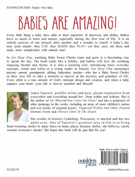 BABIES ARE AMAZING! Every little thing a baby does adds to their repertoire of discovery and ability. Babies have so much to learn and master, especially during the first year of life. It is an orderly process of one miracle after another and a wonder to watch! A baby's day may seem simple-they EAT, they SLEEP, they PLAY-yet they carry out these and many more complexities with natural ease! In Eat Sleep Play, watching Baby Sweet Cheeks learn and grow is a fascinating way to spend the day. The book reads like a lullaby, and babies will love the soothing singsong rhythm and rhyme. It is also a teaching tool; introducing basic everyday concepts, words and colors to a young reader or listener. Eat Sleep Play encourages anyone-parent, grandparent, sibling, babysitter, teacher-who has a Baby Sweet Cheeks in their own life to take a moment to marvel at the mystery and grandeur of life. Every child is a true miracle of God's intricate design and creation, and when a baby captures your heart-your life is forever enriched and blessed!