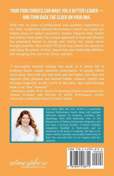 Your food choices can make you a better leader-and turn back the clock on your DNA. With over 20 years of professional and academic experience in her field, Leadership Optimal Performance Coach Luci Gabel has helped many of today's successful leaders improve their health and achieve their goals. Her unique approach to food and lifestyle has generated boosts in energy and vitality her clients never thought possible. Now in Eat to Lead, Luci shares her secrets to unlocking the power of food, improving your leadership abilities, and changing how you look, think, and feel. In as little as six weeks you can easily be eating smarter and experiencing how food can help you start your day strong, have long-lasting energy, make better decisions, stay focused, sustain good moods, get more sleep, avoid illness, and perform at your very best. In fact, the right food will even help turn back the clock on aging-from your brain, to your heart, to your DNA. This book isn't a diet program with specific menus and times to eat. There are no lists of foods to strictly avoid. Starting from the foundation of your current habits, you'll enhance your relationship with food and make choices that will transform your body and life. Filled with practical advice, encouragement, and the latest nutrition research that Luci breaks down in a simple way, Eat to Lead is a must-read for people who want to reach the top of their game-and stay there.
