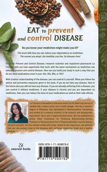 Author-signed copy (digital) of Eat to Prevent and Control Disease Do you know your medicines might make you ill? This book tells how you can reduce your dependence on medicines. The sooner you adopt, the healthier you live. Go disease-free! Over the years, we have been repeating the same eating mistakes that our parents made. This is the reason why the prevalence of diseases like diabetes, high blood pressure, and arthritis is increasing in the population over time. In Eat to Prevent and Control Disease, research scientist and registered state pharmacist La Fonceur will tell you how foods that work with the same mechanism as medicines can naturally prevent and control disease. How can you build your body in such a way that you do not need medications even in your 40s, 50s, 60s, or 70s? How can you prevent disease even if you have a family history of that disease? How can you control chronic diseases like diabetes, high blood pressure, arthritis, and many others? With a better understanding of the disease, you can control it yourself. When you follow the advice and preventive measures given in the book, if you do not have any disease, then in the future also you will not have any disease. If you are already suffering from a disease, you can control it without medicines. If your disease is chronic and you are dependent on medicines, then you can reduce the dose of your medications as well as their side effects.