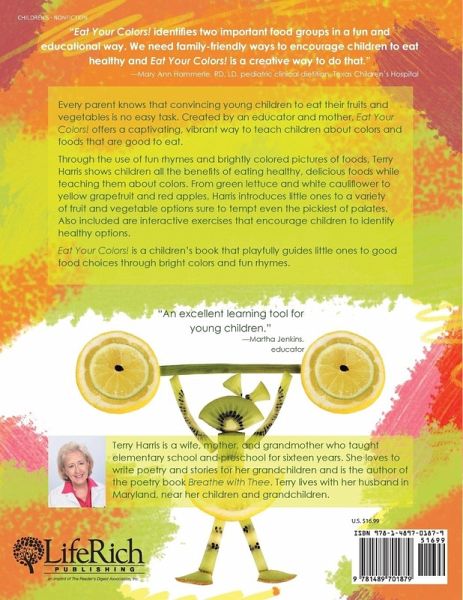 "Eat Your Colors! identifies two important food groups in a fun and educational way. We need family-friendly ways to encourage children to eat healthy and Eat Your Colors! is a creative way to do that." -Mary Ann Hammerle, RD, LD, pediatric clinical dietitian, Texas Children's Hospital Every parent knows that convincing young children to eat their fruits and vegetables is no easy task. Created by an educator and mother, Eat Your Colors! offers a captivating, vibrant way to teach children about colors and foods that are good to eat. Through the use of fun rhymes and brightly colored pictures of foods, Terry Harris shows children all the benefits of eating healthy, delicious foods while teaching them about colors. From green lettuce and white cauliflower to yellow grapefruit and red apples, Harris introduces little ones to a variety of fruit and vegetable options sure to tempt even the pickiest of palates. Also included are interactive exercises that encourage children to identify healthy options. Eat Your Colors! is a children's book that playfully guides little ones to good food choices through bright colors and fun rhymes. "An excellent learning tool for young children." -Martha Jenkins, educator