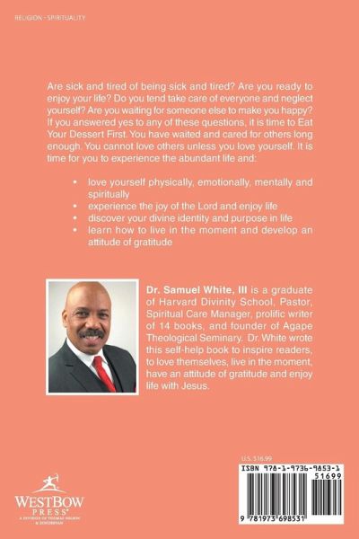 Are sick and tired of being sick and tired? Are you ready to enjoy your life? Do you tend take care of everyone and neglect yourself? Are you waiting for someone else to make you happy? If you answered yes to any of these questions, it is time to Eat Your Dessert First. You have waited and cared for others long enough. You cannot love others unless you love yourself. It is time for you to experience the abundant life and: ¿ love yourself physically, emotionally, mentally and spiritually ¿ experience the joy of the Lord and enjoy life ¿ discover your divine identity and purpose in life ¿ learn how to live in the moment and develop an attitude of gratitude