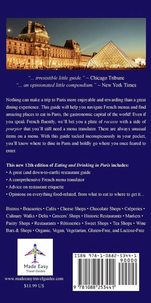 Nothing can make a trip to Paris more enjoyable and rewarding than a great dining experience. This guide will help you navigate French menus and find amazing places to eat in Paris, the gastronomic capital of the world! Even if you speak French fluently, we'll bet you a plate of racasse with a side of pourpier that you'll still need a menu translator. There are always unusual items on a menu. With this guide tucked inconspicuously in your pocket, you'll know where to dine in Paris and boldly go where you once feared to enter. This new 12th edition of Eating and Drinking in Paris includes: ¿ A great (and down-to-earth) restaurant guide ¿ Over 200 restaurants, wine bars, food shops, and more ¿ A comprehensive French menu translator ¿ Advice on restaurant etiquette ¿ Opinions on everything food-related, from what to eat to where to get it... Bistros ¿ Brasseries ¿ Cafés ¿ Cheese Shops ¿ Chocolate Shops ¿ Crêperies ¿ Culinary Walks ¿ Delis ¿ Grocers' Shops ¿ Historic Restaurants ¿ Markets ¿ Pastry Shops ¿ Restaurants ¿ Rôtisseries ¿ Sweet Shops ¿ Tea Shops ¿ Wine Bars & Shops ¿ Organic, Vegan, Vegetarian, Gluten-Free, and Lactose-Free From the author of Wining & Dining in Paris, Paris Made Easy, The Next Time I See Paris, and Paris Walks.