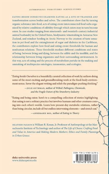 Eating beside Ourselves examines eating as a site of transfer and transformation across bodies and selves. The contributors show that by turning organic substance into food, acts of eating create interconnected food webs organized by relative conditions of edibility through which eaters may in turn become eaten. In case studies ranging from nineteenth- and twentieth-century industrial animal husbandry in the United States, biodynamic winemaking in Aotearoa New Zealand, and reindeer herding in Arctic Norway to the creation of taste sensation in pet food and the entanglement of sugar and diabetes in the Caribbean, the contributors explore how food and eating create thresholds for human and nonhuman relations. These thresholds mediate different conditions and states of being: between living and dying, between the edible and the inedible, and the relationship between living organisms and their surrounding environment. In this way, acts of eating and the process of metabolism partake in the making and unmaking of multispecies ontologies, taxonomies, and ecologies. Contributors. Alex Blanchette, Deborah Heath, Hannah Landecker, Marianne Elisabeth Lien, Amy Moran-Thomas, Heather Paxson, Harris Solomon, Emily Yates-Doerr, Wim Van Daele