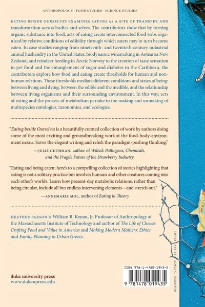 Eating beside Ourselves examines eating as a site of transfer and transformation across bodies and selves. The contributors show that by turning organic substance into food, acts of eating create interconnected food webs organized by relative conditions of edibility through which eaters may in turn become eaten. In case studies ranging from nineteenth- and twentieth-century industrial animal husbandry in the United States, biodynamic winemaking in Aotearoa New Zealand, and reindeer herding in Arctic Norway to the creation of taste sensation in pet food and the entanglement of sugar and diabetes in the Caribbean, the contributors explore how food and eating create thresholds for human and nonhuman relations. These thresholds mediate different conditions and states of being: between living and dying, between the edible and the inedible, and the relationship between living organisms and their surrounding environment. In this way, acts of eating and the process of metabolism partake in the making and unmaking of multispecies ontologies, taxonomies, and ecologies. Contributors. Alex Blanchette, Deborah Heath, Hannah Landecker, Marianne Elisabeth Lien, Amy Moran-Thomas, Heather Paxson, Harris Solomon, Emily Yates-Doerr, Wim Van Daele