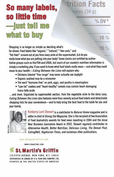 So many labels, so little time-just tell me what to buy! If you-like millions of other Americans-still don't know how to read food labels and are frustrated by the hundreds of nutrition and health claims as well as statements like free-range and grassfed, it's time to learn what you're really putting into your body...find out how to select the most healthy foods at the supermarket and still get dinner on the table by 6:00 pm with EATING BETWEEN THE LINES Shopping is no longer as simple as deciding what's for dinner. Food labels like "organic," "natural," "low carb," and "fat free!" scream out at you from every aisle at the supermarket. Some claims are certified by authoritative groups such as the FDA and USDA, but much of our country's nutrition information is simply a marketing ploy. If you want to know what food labels really mean-and what they could mean to your health-EATING BETWEEN THE LINES will explain why: --Chickens labeled "free range" may never actually see daylight --Organic seafood may be a misnomer. --The words "hormone-free" on pork, eggs and poultry is meaningless --"Low fat" cookies and "heart-healthy" cereals may contain heart damaging trans-fatty acids ...and more. Organized by supermarket section, from the vegetable aisle to the dairy case, EATING BETWEEN THE LINES also features more than seventy actual food labels and detachable shopping lists for your convenience-and to help bring the best food to the table for you and your family.