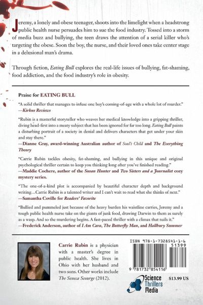 *2016 Silver IPPY Award winner in Great Lakes Best Regional Fiction* A fight against the food industry turns deadly. Jeremy, a lonely and obese teenager, shoots into the limelight when a headstrong public health nurse persuades him to sue the food industry. Tossed into a storm of media buzz and bullying, the teen draws the attention of a serial killer who's targeting the obese. Soon the boy, the nurse, and their loved ones take center stage in a delusional man's drama. In this novel of suspense, Eating Bull explores the real-life issues of bullying, fat-shaming, food addiction, and the food industry's role in obesity. "Each of Rubin's characters is carefully developed and believable."--Akron Beacon Journal "A deftly crafted novel of suspense and a compelling read from beginning to end...Very highly recommended."--Midwest Book Review "A solid thriller that manages to infuse one boy's coming-of-age with a whole lot of murder."--Kirkus Reviews