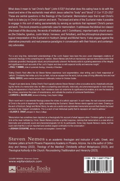 What does it mean to "eat Christ's flesh" (John 6:53)? And what does this eating have to do with the bread and wine of the eucharistic meal which Jesus called his "body" and "blood" (1 Cor 11:23-25)? These are central questions in the theology of the Eucharist. Memorialism says that to eat Christ's flesh is to take joy in Christ's person and work. The bread and wine of the Eucharist make it possible to engage in this sort of eating sacramentally by serving as symbols that represent Christ's person and work. This book presents a systematic case for memorialism. It addresses the biblical loci classici (the bread of life discourse, the words of institution, and 1 Corinthians), important early church sources (the Didache, Ignatius, Justin Martyr, Irenaeus, and Tertullian), and the philosophical-phenomenological interpretation of the Eucharist in Huldrych Zwingli and Michel Henry. It also argues against the alternative pneumatic and real presence paradigms in conversation with their historic and contemporary advocates.