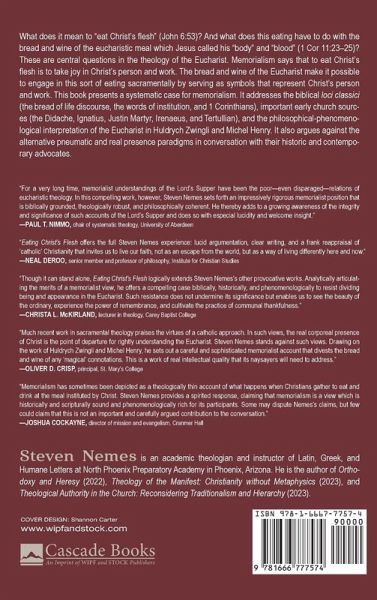 What does it mean to "eat Christ's flesh" (John 6:53)? And what does this eating have to do with the bread and wine of the eucharistic meal which Jesus called his "body" and "blood" (1 Cor 11:23-25)? These are central questions in the theology of the Eucharist. Memorialism says that to eat Christ's flesh is to take joy in Christ's person and work. The bread and wine of the Eucharist make it possible to engage in this sort of eating sacramentally by serving as symbols that represent Christ's person and work. This book presents a systematic case for memorialism. It addresses the biblical loci classici (the bread of life discourse, the words of institution, and 1 Corinthians), important early church sources (the Didache, Ignatius, Justin Martyr, Irenaeus, and Tertullian), and the philosophical-phenomenological interpretation of the Eucharist in Huldrych Zwingli and Michel Henry. It also argues against the alternative pneumatic and real presence paradigms in conversation with their historic and contemporary advocates.