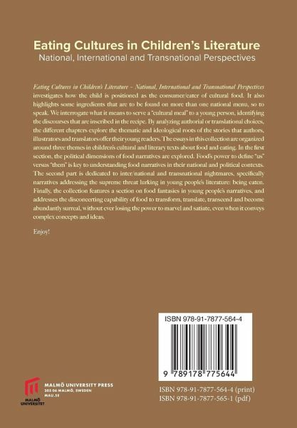 Eating Cultures in Children's Literature - National, International and Transnational Perspectives investigates how the child is positioned as the consumer/eater of cultural food. It also highlights some ingredients that are to be found on more than one national menu, so to speak. We interrogate what it means to serve a "cultural meal" to a young person, identifying the discourses that are inscribed in the recipe. By analyzing authorial or translational choices, the different chapters explore the thematic and ideological roots of the stories that authors, illustrators and translators offer their young readers. The essays in this collection are organized around three themes in children's cultural and literary texts about food and eating. In the first section, the political dimensions of food narratives are explored. Food's power to define "us" versus "them" is key to understanding food narratives in their national and political contexts. The second part is dedicated to inter/national and transnational nightmares, specifically narratives addressing the supreme threat lurking in young people's literature: being eaten. Finally, the collection features a section on food fantasies in young people's narratives, and addresses the disconcerting capability of food to transform, translate, transcend and become abundantly surreal, without ever losing the power to marvel and satiate, even when it conveys complex concepts and ideas. Enjoy!