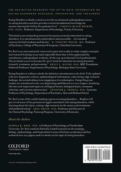 * Chapter 1 Introduction: What Are Eating Disorders? * Anorexia Nervosa * Bulimia Nervosa * Binge Eating DisorderBinge Eating Disorder * Other Specified Feeding or Eating Disorder * Unspecified Feeding or Eating Disorder * Eating Disorders as a Continuum of Problems * Chapter 2 Related Conditions that are Not Eating Disorders * Pica * Rumination Disorder * Avoidant/Restrictive Food Intake Disorder * Obesity * Chapter 3 Who Suffers from Eating DisordersWWho Suffers from Eating Disorders? * Stereotype of Who Suffers from Eating Disorders * Eating Disorders and Gender * Eating Disorders and Race/Ethnicity * Eating Disorders in Non-Western Cultures * Eating Disorders over Time * Chapter 4 Finding the Causes of Eating Disorders: Going Beyond Descriptive Methods * Hypotheses * Longitudinal Studies * Experimental Research Studies * Naturalistic Investigations * Chapter 5 Body Image, Dieting, and Eating Disorders: Is the Media to Blame? * Cultural Ideal of Thinness * Why Does Thin = Good? * Societal Denigration of Overweight/Obesity * Body Image * Dieting * Chapter 6 Family and Peer Factors in the Development of Eating Pathology * Psychoanalytic Model of Family Influence * Psychodynamic Model of Family Influence * Family Systems Model of Family Influence * Social Learning Model of Eating Disorders * Peer Influences on Eating Pathology * Chapter 7 Psychological Factors in the Development of Eating Disorders: The Contributions of Personality and Cognitive-Affective Processes * Personality * Cognitive and Affective Processes * Chapter 8 Biological Bases, Correlates, and Consequences of Eating Disorders * Brain Function and Eating Disorders * Genetic Contributions to Eating Disorders * Physical Consequences of Eating Disorders * Chapter 9 Treatment * Treatment Use * Treatment Modalities * Psychotherapy Content and Theoretical Orientations * Nonpsychotherapy Interventions * Chapter 10 Prevention * Prevention Paradigms * Prevention Themes and Content * Implementing Prevention and Levels of Intervention * Chapter 11 Long-Term Course and Outcome * Anorexia Nervosa * Bulimia Nervosa * Binge-Eating Disorder * Purging Disorder * Comparison of DSM-5 Eating Disorders * Chapter 12 Conclusion * Case Studies Revisited * Future Directions * Glossary * References * About the Author * Name Index * Subject Index