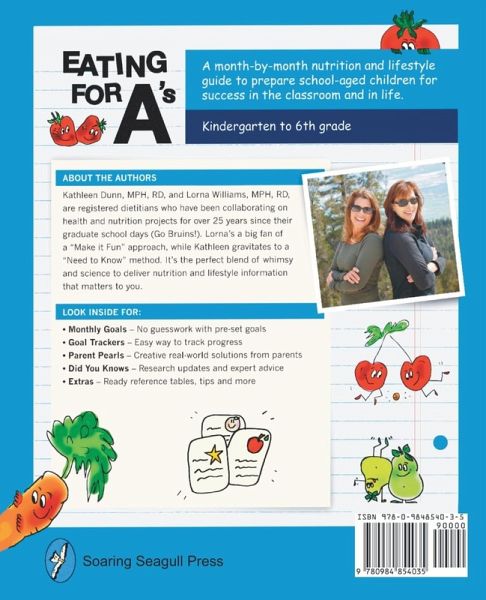 Are you looking for ways to help your child stay focused, engaged and excited about learning in the classroom? The solution may be easier than you may think. Get ready to cut through the noise to get to what matters most so you can prepare your child for success in the classroom (and in life). Updated with the latest research, this second edition of Eating for A's: A month-by-month nutrition and lifestyle guide to help raise smarter children (Kindergarten to 6th grade) features monthly brain-building habits for your child organized around the activities of a typical school year so you can put them into practice in real life. Your real life. More than 320 pages packed with: Monthly goals. Pre-set goals to take the guesswork out of choosing goals that can make a big difference in your child's success in school. Parent Pearls. Creative real-world solutions from parents. Did You Knows. Research updates and expert advice. My Smart Tracker forms. Makes monthly goal tracking fun and easy. Tables, Tips & More. Daily nutrition needs to target & ideas for success in the kitchen. References. Scientific articles and other resources are fully referenced. For most parents of young children, it's second nature to juggle schedules around the months of a typical school year. Why not simplify things and use this same by-the-month mindset to shape healthy, brain-building habits for your kids? Table of Contents Part 1 Introduction Chapter 1: Start Here Part 2 Fall Days Chapter 2: September - Family Meals Chapter 3: October - Feed a Growing Brain Chapter 4: November - Eat Your Colors Part 3 Winter Season Chapter 5: December - Sleep, De-Stress & Learn Chapter 6: January - Pack a Power Lunch Chapter 7: February - Kids in the Kitchen Part 4 Spring Fever Chapter 8: March - Fit Body, Fit Brain Chapter 9: April - Celebration beyond Cupcakes Chapter 10: May - New Foods for Curious Minds Part 5 Summer Fun Chapter 11: June - The Wonders of Water Chapter 12: July - Label Reading Short Cuts Chapter 13: August - Prep for a New School Year Part 6 Extras Chapter 14: Go for the Goal Chapter 15: Tables, Tips & More Glossary References Index About the Authors Kathleen Dunn, MPH, RD, and Lorna Williams, MPH, RD, are registered dietitian nutritionists who have been collaborating on health and nutrition projects for over 25 years since their graduate school days (Go Bruins!). Lorna's a big fan of a "Make it Fun" approach, while Kathleen gravitates to a "Need to Know" method. It's the perfect blend of whimsy and science to deliver nutrition information that matters.