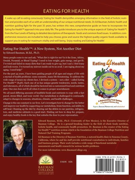 A wake up call to eating consciously! Eating for Health demystifies emerging information in the field of holistic nutrition and provides each of us with an understanding of our unique nutritional needs. Dr. Ed Bauman, holistic health and nutrition guiding light for the past 35 years, has written this new, comprehensive guide on how to incorporate the Eating for Health¿ approach into your daily life. The guide introduces you to the unique aspects of Eating for Health¿, from the Four Levels of Eating, to detailed descriptions of therapeutic foods and common food issues. In addition, comprehensive resources are included to help you choose, grow and source the highest quality organic foods available to support you in eating for maximum vitality and well-being. Enjoy reading and Eating for Health!