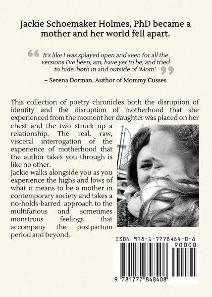 Jackie Schoemaker Holmes became a mother and her world fell apart. This collection of poetry chronicles both the disruption of identity and the disruption of motherhood that Jackie Schoemaker Holmes experienced from the moment her daughter was placed on her chest and the two struck up a relationship. The real, raw, visceral interrogation of the experience of motherhood that the author takes you through is like no other. Jackie Schoemaker Holmes, PhD walks alongside you as you experience the highs and lows of what it means to be a mother in contemporary society and takes a no-holds-barred approach to the multifarious and sometimes monstrous feelings that accompany the postpartum period and beyond.