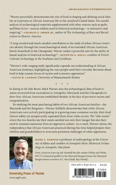 In Eating in the Side Room, Mark Warner uses the archaeological data of food remains recovered from excavations in Annapolis, Maryland, and the Chesapeake as a point of departure to examine how material culture shaped African American identity in one of the country's oldest cities. Warner skillfully demonstrates how African Americans employed food as a tool for expressing and defending their cultural heritage while living in a society that attempted to ignore and marginalize them. The ""side rooms"" where the families ate their meals not only satisfied their hunger but also their need to belong. As a result, Warner claims, the independence that African Americans practiced during this time helped prepare their children and grandchildren to overcome greater challenges of white oppression.