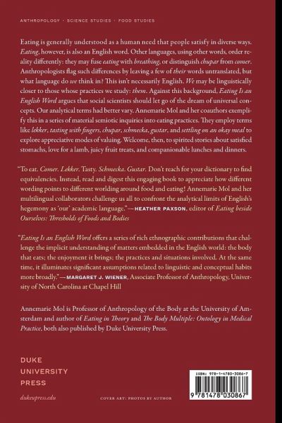 Eating is generally understood as a human need that people satisfy in diverse ways. Eating, however, is also an English word. Other languages, using other words, order reality differently: they may fuse eating with breathing, or distinguish chupar from comer. Anthropologists flag such differences by leaving a few of their words untranslated, but what language do we think in? This isn't necessarily English. We may be linguistically closer to those whose practices we study: them. Against this background, Eating Is an English Word argues that social scientists should let go of the dream of universal concepts. Our analytical terms had better vary. Annemarie Mol and her coauthors exemplify this in a series of material semiotic inquiries into eating practices. They employ terms like lekker, tasting with fingers, chupar, schmecka, gustar, and settling on an okay meal to explore appreciative modes of valuing. Welcome, then, to spirited stories about satisfied stomachs, love for a lamb, juicy fruit treats, and companionable lunches and dinners.