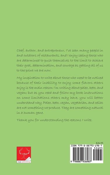 Chef, author, and entrepreneur, I've seen many people in and outdoors of restaurants, and I enjoy seeing those who are determined to push themselves to the limit to achieve their goal, determination, and courage as getting all of us to the point we are now. My inspiration to write about those who need to be noticed because of their inability to enjoy some flavors others enjoy is the main reason I'm writing about paleo, keto, and vegan; but as you read and follow my book instructions on some limitations others may have, you will better understand why. Paleo, keto, vegan, vegetarian, and celiac are not something we produce. They are something natural in a human gene. Thank you for understanding the reasons I write.