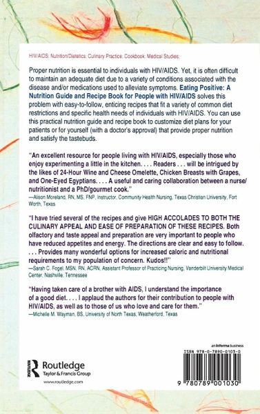 Proper nutrition is essential to individuals with HIV/AIDS. Yet, it is often difficult to maintain an adequate diet due to a variety of conditions associated with the disease and/or medications used to alleviate symptoms. Eating Positive: A Nutrition Guide and Recipe Book for People with HIV/AIDS solves this problem with easy-to-follow, enticing recipes that fit a variety of common diet restrictions and specific health needs of individuals with HIV/AIDS. You can use this practical nutrition guide and recipe book to customize diet plans for your patients or for yourself (with a doctor's approval) that provide proper nutrition and satisfy the tastebuds.