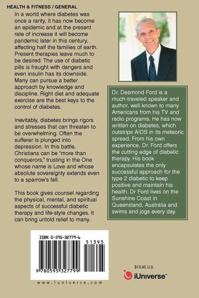 In a world where diabetes was once a rarity, it has now become an epidemic and at the present rate of increase it will become pandemic later in this century, affecting half the families of earth. Present therapies leave much to be desired. The use of diabetic pills is fraught with dangers and even insulin has its downside. Many can pursue a better approach by knowledge and discipline. Right diet and adequate exercise are the best keys to the control of diabetes. Inevitably, diabetes brings rigors and stresses that can threaten to be overwhelming. Often the sufferer is plunged into depression. In this battle, Christians can be "more than conquerors," trusting in the One whose name is Love and whose absolute sovereignty extends even to a sparrow's fall. This book gives counsel regarding the physical, mental, and spiritual aspects of successful diabetic therapy and life-style changes. It can bring untold relief to many.