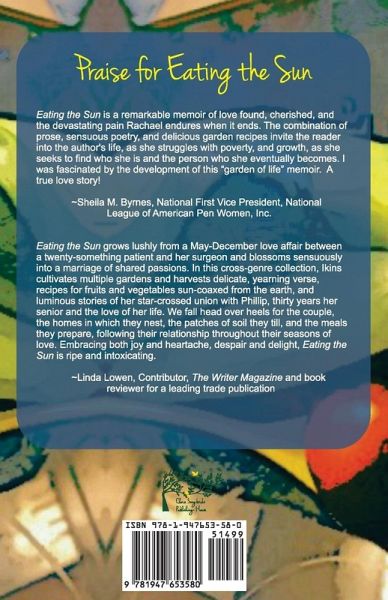 Eating the Sun grows lushly from a May-December love affair between a twenty-something patient and her surgeon and blossoms sensuously into a marriage of shared passions. In this cross-genre collection, Ikins cultivates multiple gardens and harvests delicate, yearning verse, recipes for fruits and vegetables sun-coaxed from the earth, and luminous stories of her star-crossed union with Phillip, thirty years her senior and the love of her life. We fall head over heels for the couple, the homes in which they nest, the patches of soil they till, and the meals they prepare, following their relationship throughout their seasons of love. Embracing both joy and heartache, despair and delight, Eating the Sun is ripe and intoxicating. ~Linda Lowen, Contributor, The Writer Magazine and book reviewer for a leading trade publication