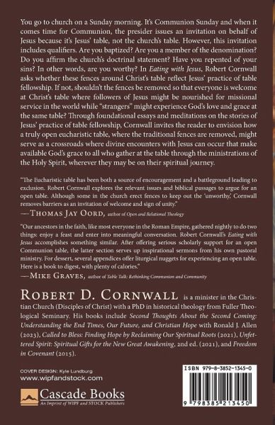 You go to church on a Sunday morning. It’s Communion Sunday and when it comes time for Communion, the presider issues an invitation on behalf of Jesus because it’s Jesus’ table, not the church’s table. However, this invitation includes qualifiers. Are you baptized? Are you a member of the denomination? Do you affirm the church’s doctrinal statement? Have you repented of your sins? In other words, are you worthy? In Eating with Jesus, Robert Cornwall asks whether these fences around Christ’s table reflect Jesus' practice of table fellowship. If not, shouldn’t the fences be removed so that everyone is welcome at Christ’s table where followers of Jesus might be nourished for missional service in the world while "strangers" might experience God's love and grace at the same table? Through foundational essays and meditations on the stories of Jesus’ practice of table fellowship, Cornwall invites the reader to envision how a truly open eucharistic table, where the traditional fences are removed, might serve as a crossroads where divine encounters with Jesus can occur that make available God's grace to all who gather at the table through the ministrations of the Holy Spirit, wherever they may be on their spiritual journey.