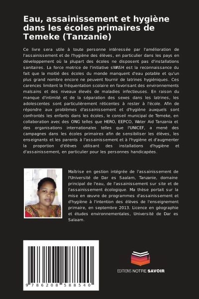 Ce livre sera utile à toute personne intéressée par l'amélioration de l'assainissement et de l'hygiène des élèves, en particulier dans les pays en développement où la plupart des écoles ne disposent pas d'installations sanitaires. La force motrice de l'initiative sWASH est la reconnaissance du fait que la moitié des écoles du monde manquent d'eau potable et qu'un plus grand nombre encore ne peuvent fournir de latrines hygiéniques. Ces carences limitent la fréquentation scolaire en favorisant des environnements malsains et des niveaux élevés de maladies infectieuses. En raison du manque d'intimité et de la séparation des sexes dans les latrines, les adolescentes sont particulièrement réticentes à rester à l'école. Afin de répondre aux problèmes d'assainissement et d'hygiène auxquels sont confrontés les enfants dans les écoles, le conseil municipal de Temeke, en collaboration avec des ONG telles que HERO, EEPCO, Water Aid Tanzania et des organisations internationales telles que l'UNICEF, a mené des campagnes dans les écoles primaires afin de sensibiliser les élèves, les enseignants et les parents à l'assainissement et à l'hygiène et d'augmenter la proportion d'élèves utilisant des installations d'hygiène et d'assainissement, en particulier pour les personnes handicapées.