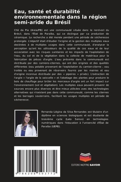 Chã da Pia (Areia/PB) est une communauté située dans le nord-est du Brésil, dans l'État de Paraíba, qui se distingue par sa production de céramique. La recherche a été menée pendant une période de sécheresse prolongée. L'objectif était d'étudier l'origine et la gestion des multiples eaux destinées à de multiples usages dans cette communauté, d'analyser la perception qu'ont les utilisateurs de la qualité de ces eaux et de leur association avec les risques sanitaires et les impacts de l'exploitation de l'eau, du sol et de la végétation dans la collecte de matériaux pour la fabrication de pièces d'argile. L'eau présente dans la communauté est distribuée par des camions-citernes, qui ont des origines et des qualités différentes (eau potable provenant de l'exploitation du camion-citerne ; eau traitée ou eau provenant de réservoirs fournis par les mairies et eau d'origine inconnue distribuée par des « pipeiros » privés). L'extraction de l'argile « l'argile de la vaisselle » et l'abattage des plantes pour produire le bois de chauffage pour brûler les morceaux d'argile ont un fort impact sur l'environnement (sol et végétation). Les multiples eaux peuvent provenir de sources encore plus diverses et être mieux utilisées avec des technologies alternatives qui n'existent pas dans cette communauté, comme les citernes et les barrages souterrains, facilitant les usages multiples en période de sécheresse.