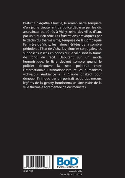Pastiche d'Agatha Christie, le roman narre l'enquête d'un jeune Lieutenant de police dépassé par les dix assassinats perpétrés à Vichy, reine des villes d'eau, par un tueur en série. Les frustrations provoquées par le déclin du thermalisme, l'emprise de la Compagnie Fermière de Vichy, les haines héritées de la sombre période de l'Etat de Vichy, les jalousies conjugales, les supposées visées chinoises sur la ville sont la trame de fond de l'intrigue. Débutant sur un mode humoristique, le livre devient sombre quand le policier découvre la lutte politique entre l'internationale ultranationaliste et les humanistes vichyssois. Ambiance à la Claude Chabrol pour dénouer l'intrigue par un portrait acide des moeurs légères de la gentry bourbonnaise. Une visite de la ville thermale agrémentée de dix meurtres.