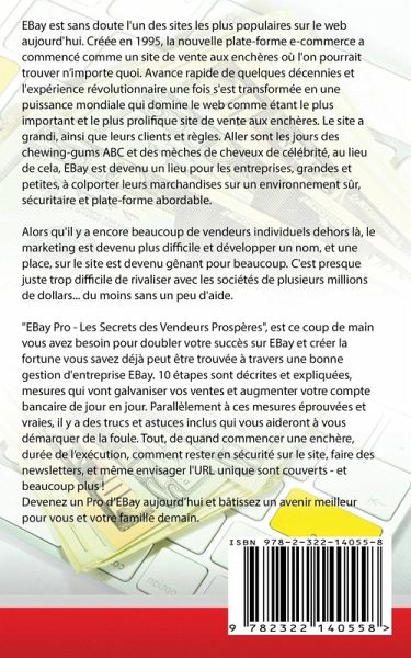 EBay est sans doute l'un des sites les plus populaires sur le web aujourd'hui. Créée en 1995, la nouvelle plate-forme e-commerce a commencé comme un site de vente aux enchères où l'on pourrait trouver n'importe quoi. Avance rapide de quelques décennies et l'expérience révolutionnaire une fois s'est transformée en une puissance mondiale qui domine le web comme étant le plus important et le plus prolifique site de vente aux enchères. Le site a grandi, ainsi que leurs clients et règles. Aller sont les jours des chewing-gums ABC et des mèches de cheveux de célébrité, au lieu de cela, EBay est devenu un lieu pour les entreprises, grandes et petites, à colporter leurs marchandises sur un environnement sûr, sécuritaire et plate-forme abordable.Alors qu'il y a encore beaucoup de vendeurs individuels dehors là, le marketing est devenu plus difficile et développer un nom, et une place, sur le site est devenu gênant pour beaucoup. C'est presque juste trop difficile de rivaliser avec les sociétés de plusieurs millions de dollars... du moins sans un peu d'aide."EBay Pro - Les Secrets des Vendeurs Prospères", est ce coup de main vous avez besoin pour doubler votre succès sur EBay et créer la fortune vous savez déjà peut être trouvée à travers une bonne gestion d'entreprise EBay. 10 étapes sont décrites et expliquées, mesures qui vont galvaniser vos ventes et augmenter votre compte bancaire de jour en jour.Parallèlement à ces mesures éprouvées et vraies, il y a des trucs et astuces inclus qui vous aideront à vous démarquer de la foule. Tout, de quand commencer une enchère, durée de l'exécution, comment rester en sécurité sur le site, faire des newsletters, et même envisager l'URL unique sont couverts - et beaucoup plus!Devenez un Pro d'EBay aujourd'hui et bâtissez un avenir meilleur pour vous et votre famille demain.