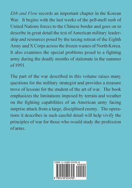 Ebb and Flow records an important chapter in the Korean War. It begins with the last weeks of the pell-mell rush of United Nations forces to the Chinese border and goes on to describe in great detail the test of American military leadership and resources posed by the taxing retreat of the Eighth Army and X Corps across the frozen wastes of North Korea. It also examines the special problems posed to a fighting army during the deadly months of stalemate in the summer of 1951. The part of the war described in this volume raises many questions for the military strategist and provides a treasure trove of lessons for the student of the art of war. The book emphasizes the limitations imposed by terrain and weather on the fighting capabilities of an American army facing surprise attack from a large, disciplined enemy. The operations it describes in such careful detail will help vivify the principles of war for those who would study the profession of arms.