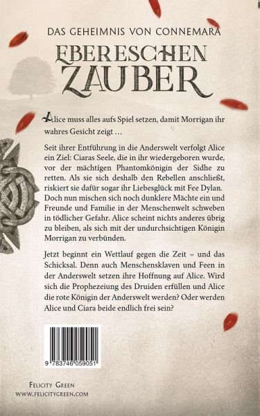 DAS GEHEIMNIS VON CONNEMARA wird endlich gelüftet!Alice muss alles aufs Spiel setzen, damit Morrigan ihr wahres Gesicht zeigt ...Seit ihrer Entführung in die Anderswelt verfolgt Alice ein Ziel: Ciaras Seele, die in ihr wiedergeboren wurde, vor der mächtigen Phantomkönigin der Sidhe zu retten. Als sie sich deshalb den Rebellen anschließt, riskiert sie dafür sogar ihr Liebesglück mit Fee Dylan. Doch nun mischen sich noch dunklere Mächte ein und Freunde und Familie in der Menschenwelt schweben in tödlicher Gefahr. Alice scheint nichts anderes übrig zu bleiben, als Ciaras Seele aufs Spiel zu setzen und sich mit der undurchsichtigen Königin Morrigan zu verbünden. Jetzt beginnt ein Wettlauf gegen die Zeit - und das Schicksal. Denn auch Menschensklaven und Feen in der Anderswelt setzen ihre Hoffnung auf Alice. Wird sich die Prophezeiung des Druiden erfüllen und Alice die rote Königin der Anderswelt werden? Oder werden Alice und Ciara beide endlich frei sein? Lass dich von Alice auf einefantastische Reise durch das Irland der Anderswelt mitnehmen und erlebe mit ihr den abenteuerlichen Kampf gegen böse Mächte und ihr vermeintliches Schicksal: Mit EBERESCHENZAUBER kommt die fesselnde CONNEMARA-Saga zu einem fulminanten Ende.