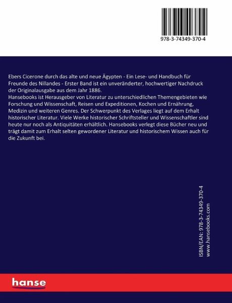 Ebers Cicerone durch das alte und neue Ägypten - Ein Lese- und Handbuch für Freunde des Nillandes - Erster Band ist ein unveränderter, hochwertiger Nachdruck der Originalausgabe aus dem Jahr 1886.