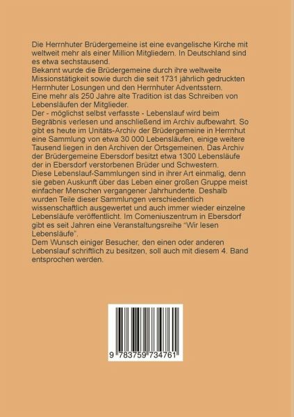 Die Herrnhuter Brüdergemeine ist eine evangelische Kirche mit weltweit mehr als einer Million Mitgliedern. In Deutschland sind es etwa sechstausend. Bekannt wurde die Brüdergemeine durch ihre weltweite Missionstätigkeit sowie durch die seit 1731 jährlich gedruckten Herrnhuter Losungen und den Herrnhuter Adventsstern. Eine mehr als 250 Jahre alte Tradition ist das Schreiben von Lebensläufen der Mitglieder. Der - möglichst selbst verfasste - Lebenslauf wird beim Begräbnis verlesen und anschließend im Archiv aufbewahrt. So gibt es heute im Unitäts-Archiv der Brüdergemeine in Herrnhut eine Sammlung von etwa 30 000 Lebensläufen, einige weitere Tausend liegen in den Archiven der Ortsgemeinen. Das Archiv der Brüdergemeine Ebersdorf besitzt etwa 1300 Lebensläufe der in Ebersdorf verstorbenen Brüder und Schwestern. Diese Lebenslauf-Sammlungen sind in ihrer Art einmalig, denn sie geben Auskunft über das Leben einer großen Gruppe meist einfacher Menschen vergangener Jahrhunderte. Deshalb wurden Teile dieser Sammlungen verschiedentlich wissenschaftlich ausgewertet und auch immer wieder einzelne Lebensläufe veröffentlicht. Im Comeniuszentrum in Ebersdorf gibt es seit Jahren eine Veranstaltungsreihe "Wir lesen Lebensläufe". Dem Wunsch einiger Besucher, den einen oder anderen Lebenslauf schriftlich zu besitzen, soll auch mit diesem Buch entsprochen werden.