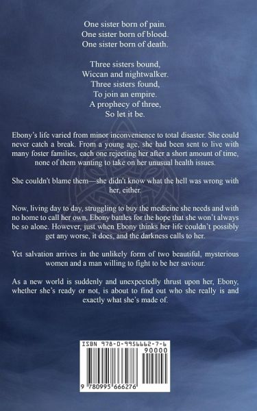 One sister born of pain. One sister born of blood. One sister born of death. Three sisters bound, Wiccan and nightwalker. Three sisters found, To join an empire. A prophecy of three, So let it be. Ebony's life varied from minor inconvenience to total disaster. She could never catch a break. From a young age, she had been sent to live with many foster families, each one rejecting her after a short amount of time, none of them wanting to take on her unusual health issues. She couldn't blame them-she didn't know what the hell was wrong with her, either. Now, living day to day, struggling to buy the medicine she needs and with no home to call her own, Ebony battles for the hope that she won't always be so alone. However, just when Ebony thinks her life couldn't possibly get any worse, it does, and the darkness calls to her. Yet salvation arrives in the unlikely form of two beautiful, mysterious women and a man willing to fight to be her saviour. As a new world is suddenly and unexpectedly thrust upon her, Ebony, whether she's ready or not, is about to find out who she really is and exactly what she's made of.