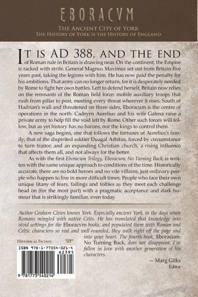 On the continent, the Empire is racked with strife. General Magnus Maximus set out from Britain five years past, taking the legions with him. He has now paid the penalty for his ambitions. That army can no longer return, for it is desperately needed by Rome to fight her own battles. Left to defend herself, Britain now relies on the remnants of the Roman field force: mobile auxiliary troops that rush from pillar to post, meeting every threat wherever it rises. South of Hadrian's wall and threatened on three sides, Eboracum is the centre of operations in the north. Cadeyrn Aurelius and his wife Galena raise a private army to help fill the void left by Rome. Other such forces will follow, but as yet history has no barons, nor the kings to control them. A new saga begins, one that follows the fortunes of Aurelius's family; that of the dispirited soldier Duagal Arbitus, forced by circumstance to turn traitor; and an expanding Christian church, a rising influence that affects them all, and not always for the better. As with the first Eboracum Trilogy, Eboracum, No Turning Back, is written with the same unique approach to conditions of the time. Historically accurate, there are no bold heroes and no vile villains, just ordinary people who happen to live in more difficult times. People who face their own unique litany of fears, failings and foibles as they meet each challenge head on (for the most part) with a pragmatic acceptance and dark humour that is strikingly familiar, even today.