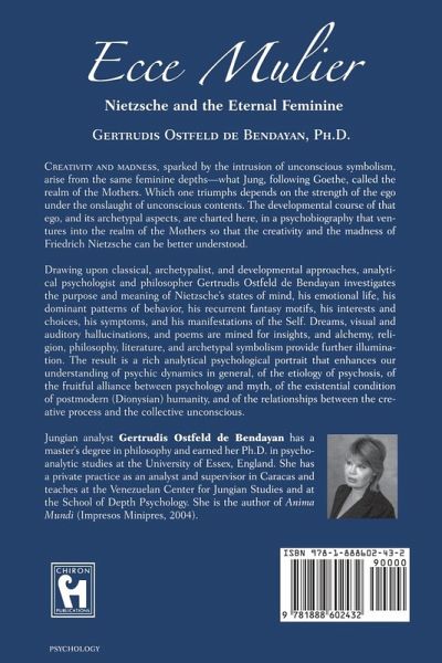 Creativity and madness, sparked by the intrusion of unconscious symbolism, arise from the same feminine depths—what Jung, following Goethe, called the realm of the Mothers. Which one triumphs depends on the strength of the ego under the onslaught of unconscious contents. The developmental course of that ego, and its archetypal aspects, are charted here, in a psychobiography that ventures into the realm of the Mothers so that the creativity and the madness of Friedrich Nietzsche can be better understood. Drawing upon classical, archetypalist, and developmental approaches, Dr. Ostfeld de Bendayán investigates the purpose and meaning of Nietzsche’s states of mind, his emotional life, his dominant patterns of behavior, his recurrent fantasy motifs, his interests and choices, his symptoms, and his manifestations of the Self. Dreams, visual and auditory hallucinations, and poems are mined for insights, and alchemy, religion, philosophy, literature, and archetypal symbolism provide further illumination. The result is a rich analytical psychological portrait that enhances our understanding of psychic dynamics in general, of the etiology of psychosis, of the fruitful alliance between psychology and myth, of the existential condition of postmodern (Dionysian) humanity, and of the relationships between the creative process and the collective unconscious.
