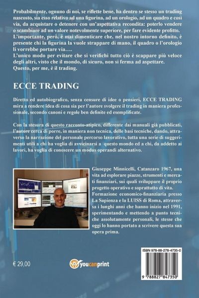 Diretto ed autobiografico, l'elaborato mira a far comprendere cosa significhi per l'autore fare trading in maniera professionale, secondo regole e canoni ben precisi. Con la stesura di questo racconto atipico, che da toni narrativi passa, secondo linee descrittive ben precise, alla trattazione di tematiche tecniche, l'autore, in maniera innovativa, espone tutta una serie di situazioni e casistiche direttamente connesse alla professione di trader, con tutti i pro ed i contro che ogni attività si porta dietro. In due parole: ECCE TRADING
