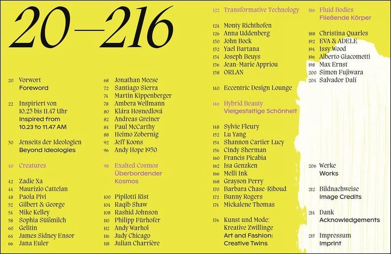 Jean-Marie Appriou, Yael Bartana, Maurizio Cattelan, Julian Charrière, Barbara Chase-Riboud, Salvador Dalí, Max Ernst, Simon Fujiwara, Isa Genzken, Gilbert & George, Mike Kelley, Martin Kippenberger, Jeff Koons, Paul McCarthy, Jonathan Meese, Paola Pivi, Christina Quarles, Pipilotti Rist, Bunny Rogers, Raqib Shaw, Cindy Sherman, Sophia Süßmilch, Anna Uddenberg, Andy Warhol, Zadie Xa, Lu Yang u.a.
