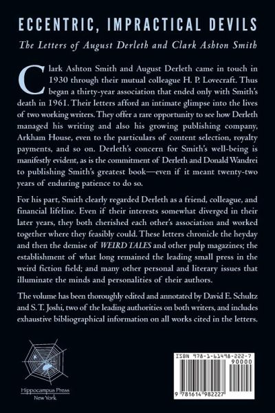 Clark Ashton Smith came in touch with August Derleth in 1930, when, following H. P. Lovecraft’s instruction, Smith forwarded to Derleth the manuscript of Lovecraft’s tale, "The Whisperer in Darkness." Derleth replied immediately and included without preliminaries several stories of his own. Thus began a correspondence, a friendship, and ultimately a business relationship that extended more than thirty years. The letters of Clark Ashton Smith and August Derleth afford an intimate glimpse into the lives of two working writers. They offer a rare opportunity to see how Derleth managed his writing and also his growing publishing company, Arkham House, even to the particulars of content selection, royalty payments, and so on. Derleth’s concern for Smith’s well-being is manifestly evident, as is the commitment of Derleth and Donald Wandrei to publishing Smith’s greatest book—even if it meant twenty-two years of enduring patience to do so. For his part, Smith clearly regarded Derleth as a friend, colleague, and financial lifeline. Even if their interests somewhat diverged in their later years, they both cherished each other’s association and worked together where they feasibly could. These letters chronicle the heyday and then the demise of Weird Tales and other pulp magazines; the establishment of what long remained the leading small press in the weird fiction field; and many other personal and literary issues that illuminate the minds and personalities of their authors.