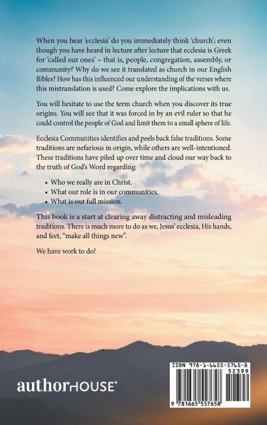 When you hear 'ecclesia' do you immediately think 'church'; even though you have heard in lecture after lecture that ecclesia is Greek for 'called out ones' - that is, people, congregation, assembly, or community? Why do we see it translated as church in our English Bibles? How has this influenced our understanding of the verses where this mistranslation is used? Come explore the implications with us. You will hesitate to use the term church when you discover its true origins. You will see that it was forced in by an evil ruler so that he could control the people of God and limit them to a small sphere of life. Ecclesia Communities identifies and peels back false traditions. Some traditions are nefarious in origin, while others are well-intentioned. These traditions have piled up over time and cloud our way back to the truth of God's Word regarding: ¿ Who we really are in Christ. ¿ What our role is in our communities. ¿ What is our full mission. This book is a start at clearing away distracting and misleading traditions. There is much more to do as we, Jesus' ecclesia, His hands, and feet, "make all things new". We have work to do!