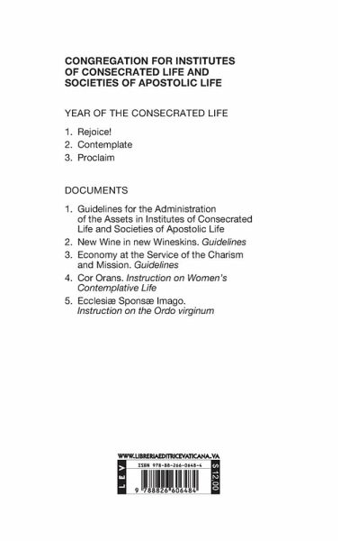 This Instruction establishes the normative principles and the guiding criteria which the Pastors of each diocese and particular Church assimilated to the diocese should apply in the pastoral care of the Ordo virginum. After outlining the biblical foundation and the typical elements of the vocation and witness of consecrated virgins (Part One), the Instruction deals with the specific configuration of the Ordo virginum within the particular Church and the universal Church (Part Two); finally it deals with the vocational discernment and itineraries for formation prior to consecration and the ongoing formation (Part Three).