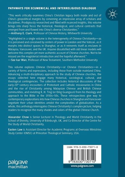 This volume explores Chinese Christianity-or Chinese Christianities-in a variety of forms and expressions, including those from outside the geopolitical boundaries of mainland China. Advancing a multi-disciplinary approach to the study of Chinese churches, the essays collected here engage many historical, sociological, cultural, and theological contingencies. The collection includes historical discussions of the early-20th-century encounters of Protestant and Catholic missionaries in China and the rise of Christianity among Malaysian Chinese and British Chinese communities. Essays examine the thinking of K. H. Ting (or Ding Guangxun), often remembered for his leadership in the Three-Self Patriotic Movement in the 1980s-90s, by revisiting his earlier theology and approach to the Bible in the 1930s-50s. These retrospectives give way to contemporary explorations into how Chinese churches negotiate their urban identities amidst the complexities of globalization in Chengdu and Shanghai, as well as in Vancouver, Canada. Taken as a whole, this collection offers close examinations into various aspects of Chinese Christianity's complex picture, helping readers to recognize the many shades and colors of the global Chinese Church.