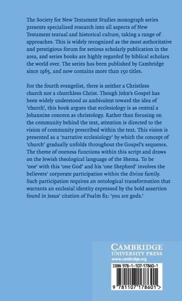 For the author of the fourth Gospel, there is neither a Christless church nor a churchless Christ. Though John's Gospel has been widely understood as ambivalent toward the idea of 'church', Andrew Byers argues that ecclesiology is as central a Johannine concern as Christology. Rather than focusing on the community behind the text, John's Gospel directs attention to the vision of community prescribed within the text, which is presented as a 'narrative ecclesiology' by which the concept of 'church' gradually unfolds throughout the Gospel's sequence. The theme of oneness functions within this script and draws on the theological language of the Shema, a centerpiece of early Jewish theology and social identity. To be 'one' with this 'one God' and his 'one Shepherd' involves the believers' corporate participation within the divine family. Such participation requires an ontological transformation that warrants an ecclesial identity expressed by the bold assertion found in Jesus' citation of Psalm 82: 'you are gods'.